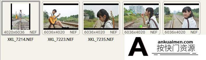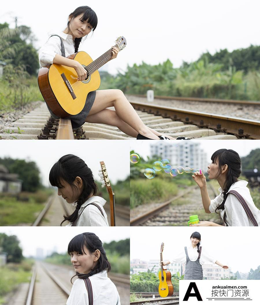 5P铁路外拍拿吉他灰色背带裤美女后期修图练习RAW原图素材