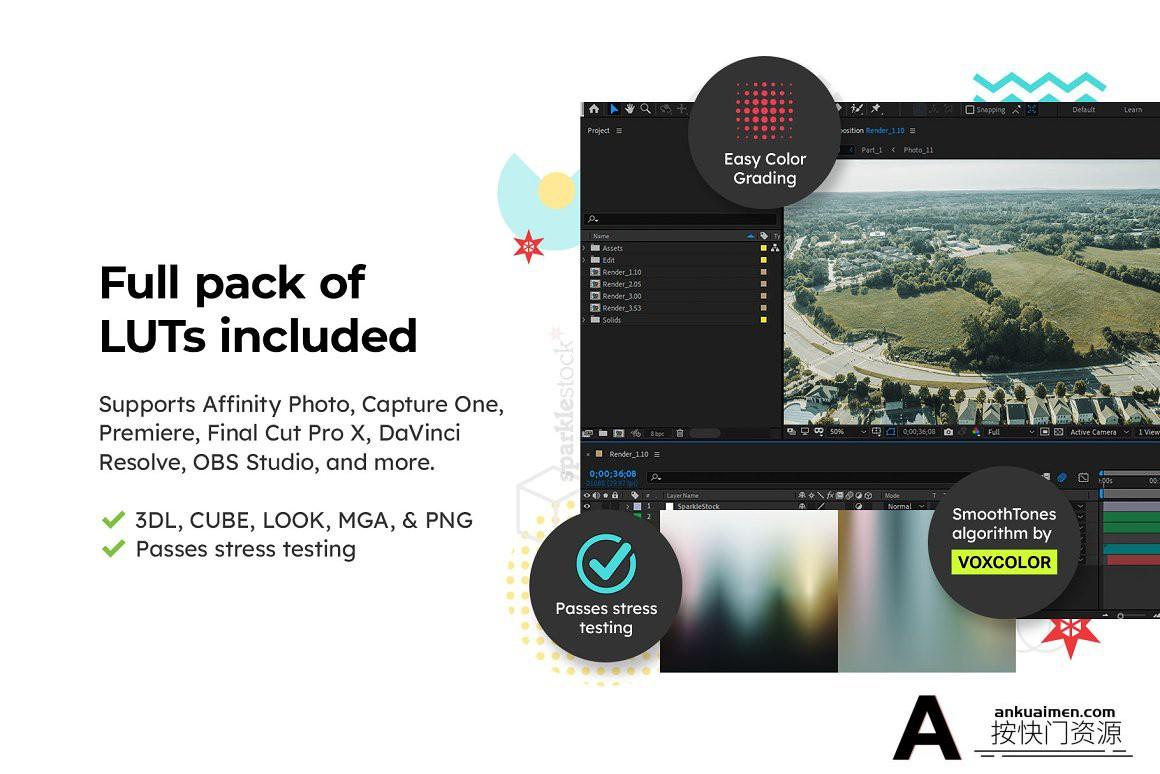 用于 Premiere Pro、After Effects、Final Cut Pro X、DaVinci Resolve、OBS Studio、Spark AR Studio 等的 LUT(3dl、cube、look、png 和 mga)