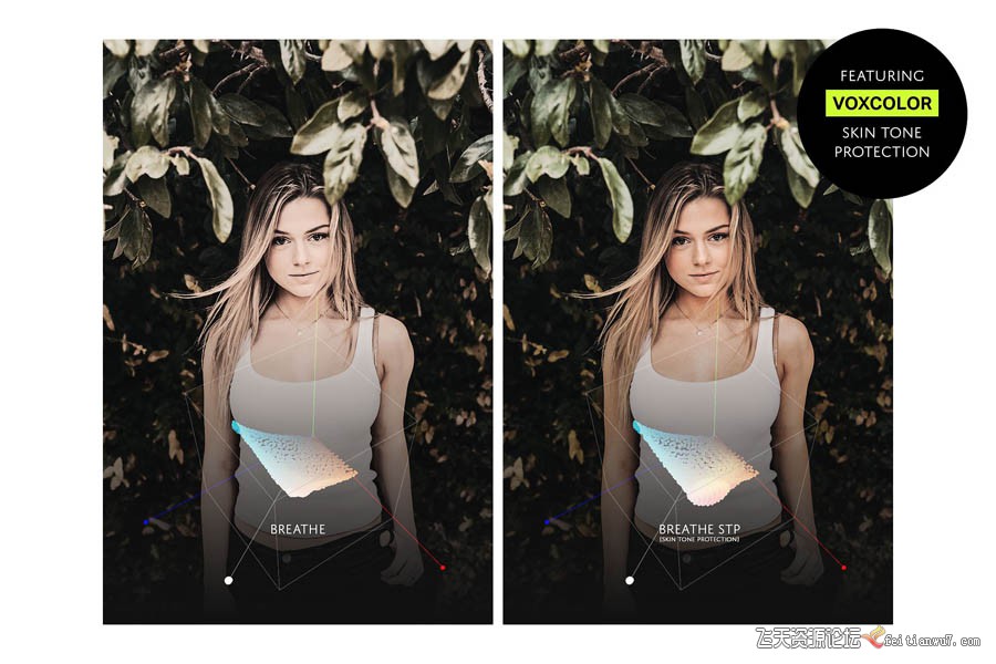对于肤色,有一整套独立的肖像。 它们外观相同,但利用VOXCOLOR Color Science带回50%的原始肤色。 这为您提供了更自然的肤色,仍然与整体颜色分级相匹配。